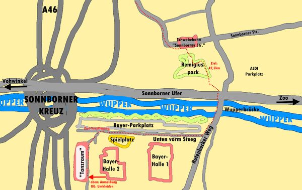 Anbei ein Plan, wo ihr auf dem Gelände (recht groß) die Anmeldung findet (hinten am Parkplatz links, zum "Tanzraum", dort drinnen dann im Vorraum), die Umkleiden, Duschen. Dort werden nach der Veranstaltung auf Urkunden geschrieben, wenn ihr eine möchtet - sonst findet ihr die auch im Internet (s. Teilnehmerliste unten)