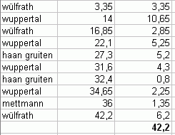Ergebnis: 4x Wuppertal 22,45km (53%), 3x Wülfrath 12,4km (29%),